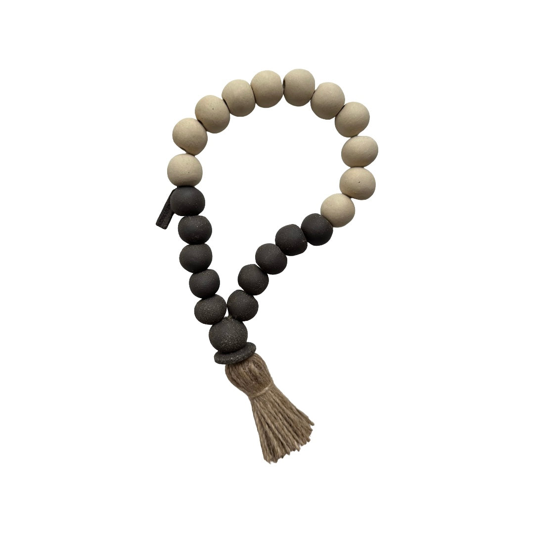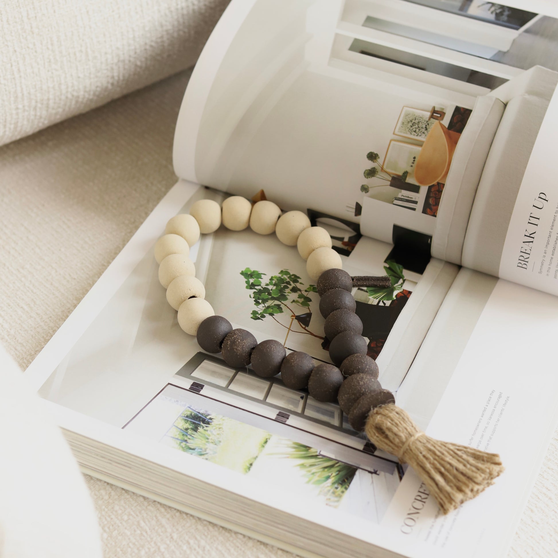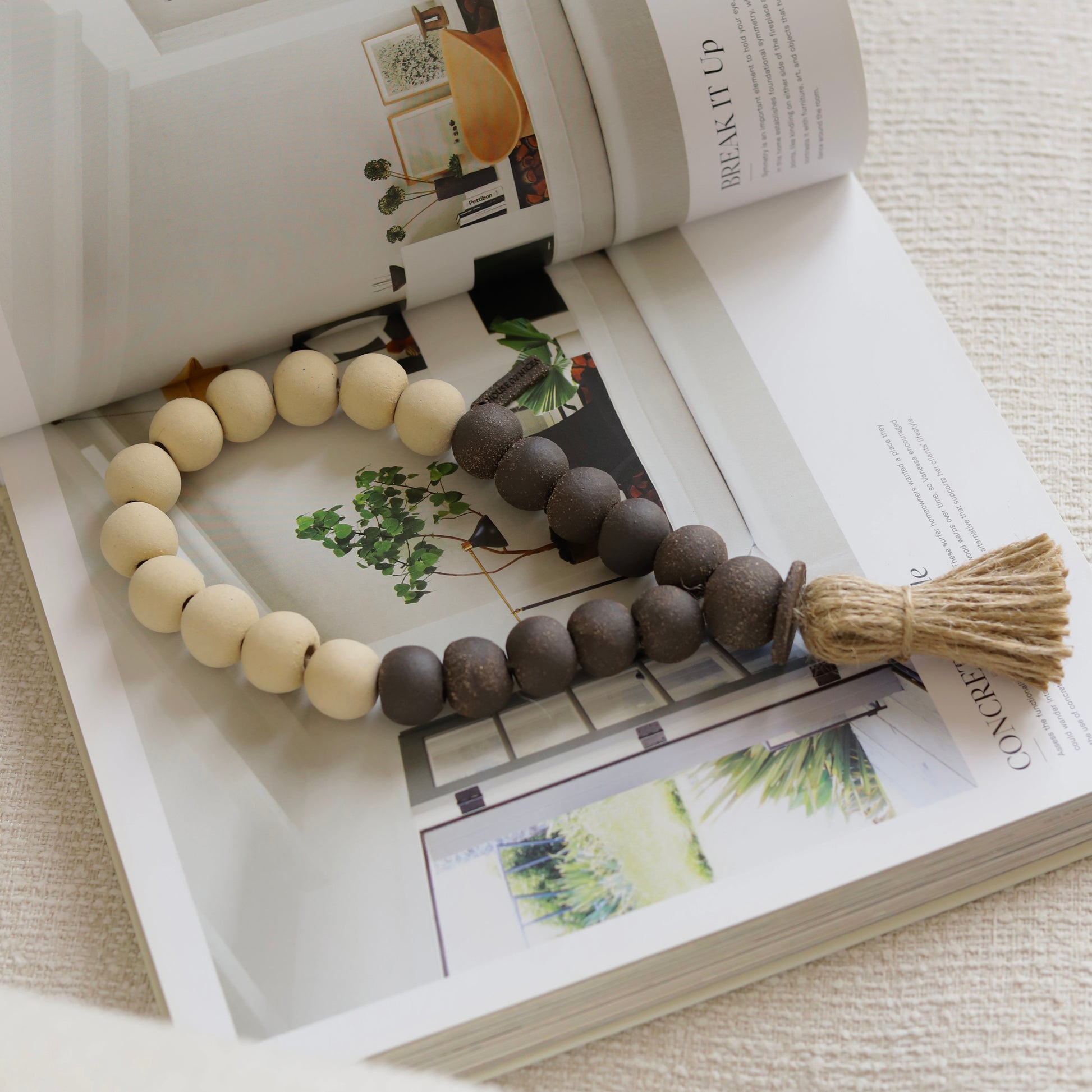 Bej ve koyu kahverengi stoneware boncuklardan oluşan bu tasarım, kontrast renk geçişleriyle çağdaş bir görünüm sunar.