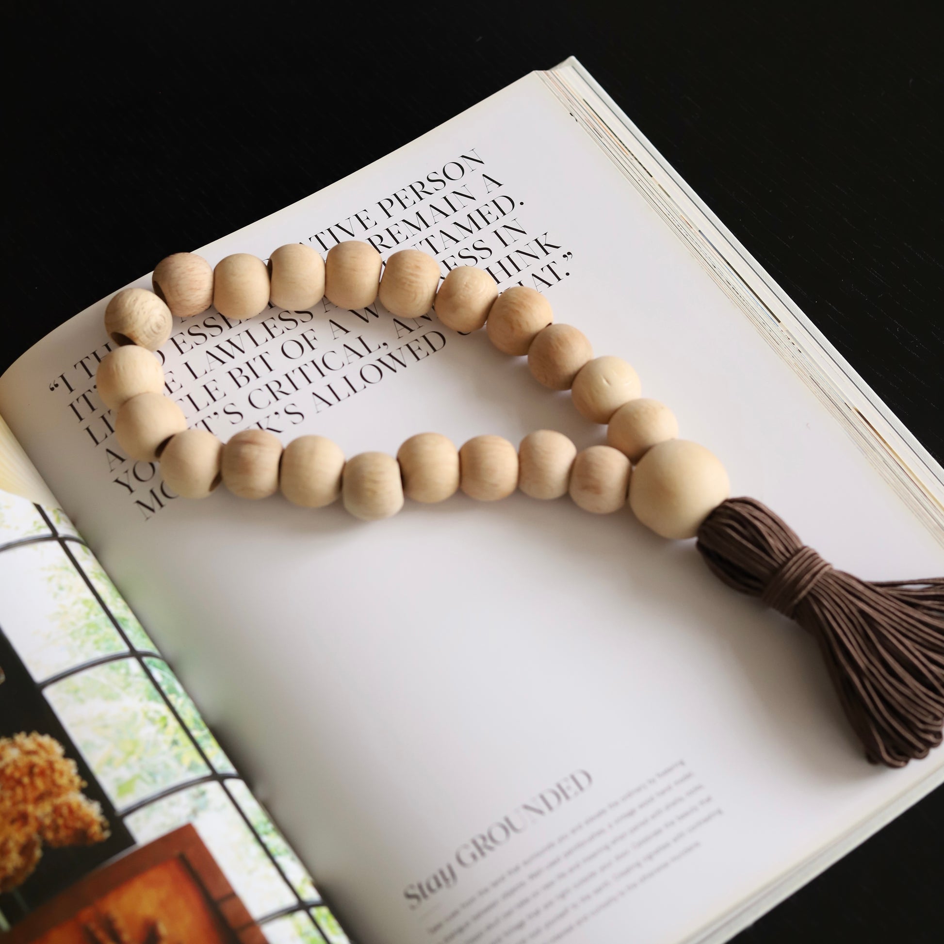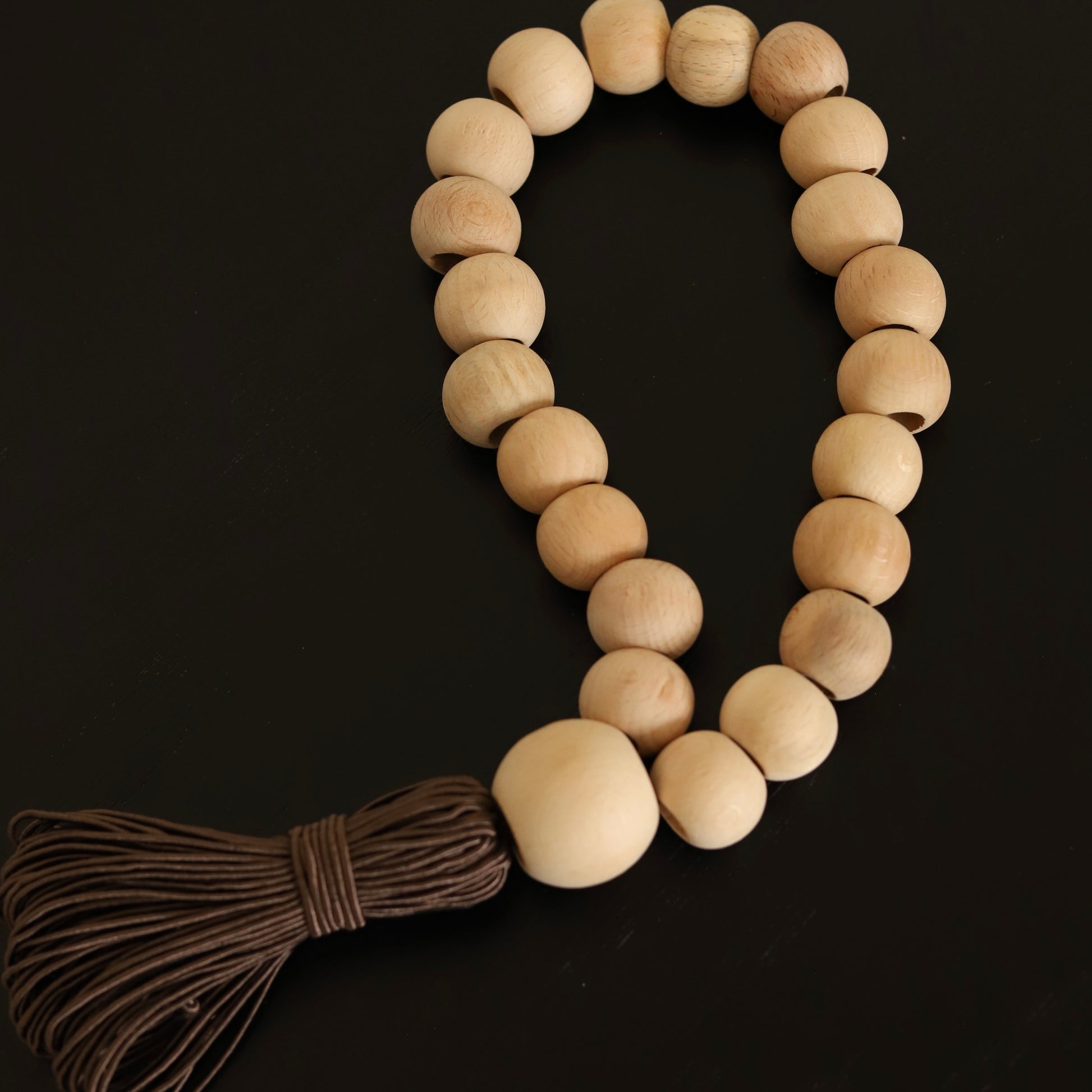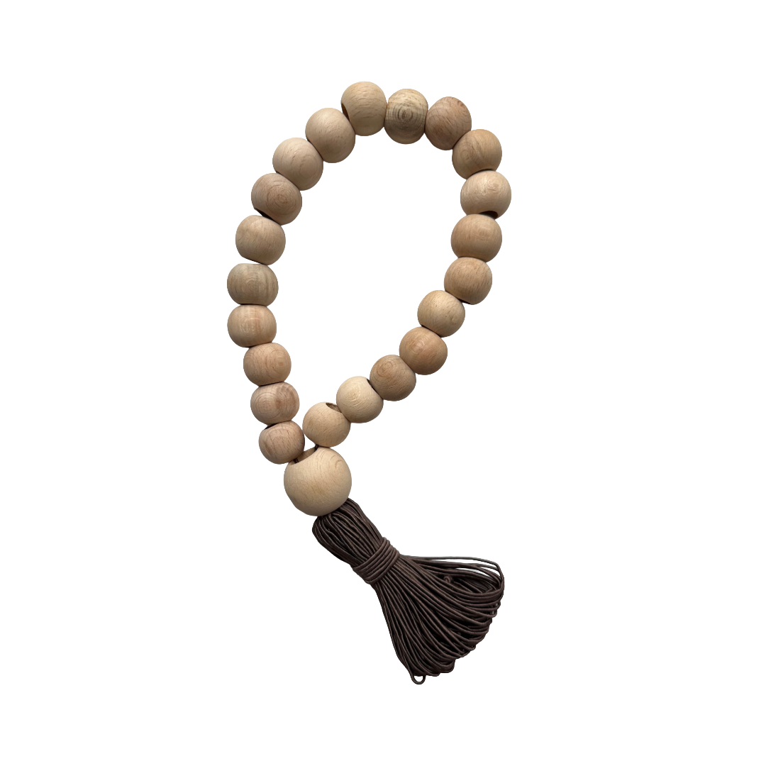 El işçiliğiyle hazırlanan bu dekoratif tesbih, sade formu ve kahverengi tonlarındaki püskülüyle rustik ve bohem dekorlara doğal bir zarafet kazandırır. Sehpa, konsol veya kitaplık düzenlemelerinde şık bir tamamlayıcı olarak kullanılabilir.